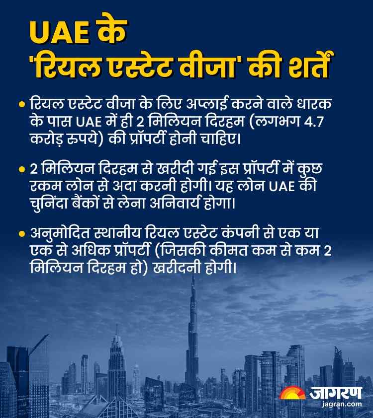 UAE Real Estate Visa संयुक्त अरब अमीरात (UAE) ने रियल एस्टेट वीजा नामक गोल्डन वीजा की एक नई कैटेगरी बनाई है। यह वीजा UAE के रियल एस्टेट में निवेश करने पर मिलेगा। रियल एस्टेट वीजा गोल्डन वीजा से महंगा होगा जिसके लिए लगभग 4.7 करोड़ रुपये की प्रॉपर्टी UAE में होनी चाहिए। वहीं प्रॉपर्टी बेचने पर वीजा रद्द हो जाएगा।
