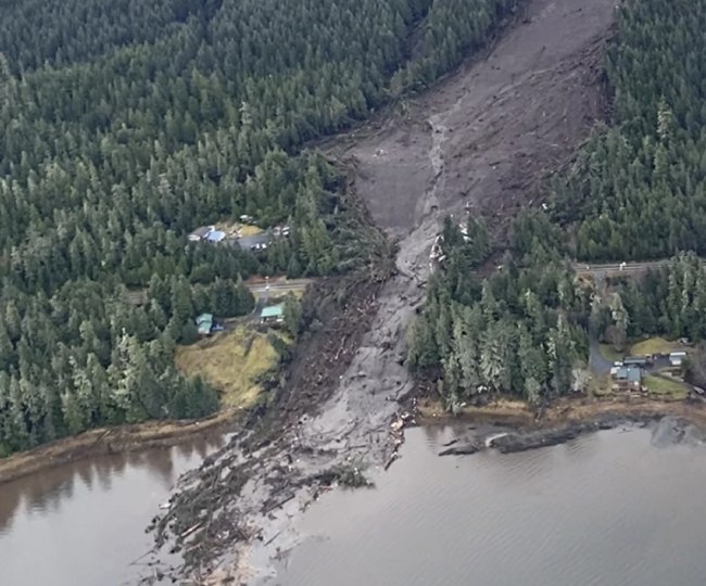 अधिकारियों ने बताया कि रैंगल, अलास्का में जिमोविया राजमार्ग के एक तटीय हिस्से के साथ सोमवार की रात को एक खड़ी, भारी जंगली पहाड़ी ढलान बन गई, जो राज्य की राजधानी जूनो से 155 मील (250 किमी) दक्षिण में लगभग 2,000 निवासियों का मछली पकड़ने और लकड़ी काटने वाला शहर है।