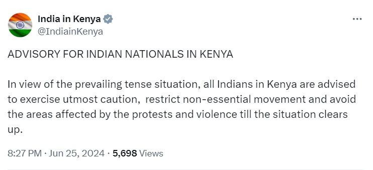 भारतीय उच्चायोग ने अपने एक्स हैंडल पर लिखा,"केन्या में भारतीय नागरिकों के लिए सलाह मौजूदा तनावपूर्ण स्थिति को देखते हुए केन्या में सभी भारतीयों को अत्यधिक सावधानी बरतने की सलाह दी जाती है। वहीं लोग बिना जरूरी काम के कहीं बाहर ना जाएं।