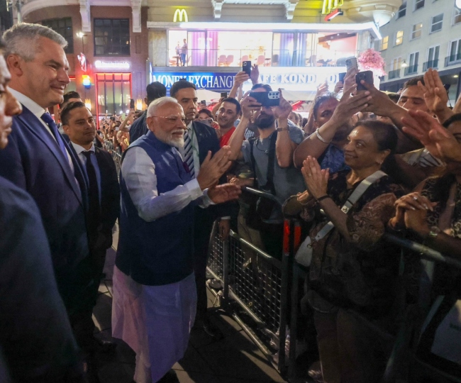 बता दें कि ऑस्ट्रिया पहुंचने के बाद वियना में भी प्रधानमंत्री नरेंद्र मोदी ने भारतवंशी लोगों से मुलाकात की। पीएम ने भारतवंशी लोगों का हाथ जोड़कर अभिवादन स्वीकार किया। इस दौरान पीएम मोदी के साथ ऑस्ट्रिया के चांसलर कार्ल नेहमर भी मौजूद रहे।