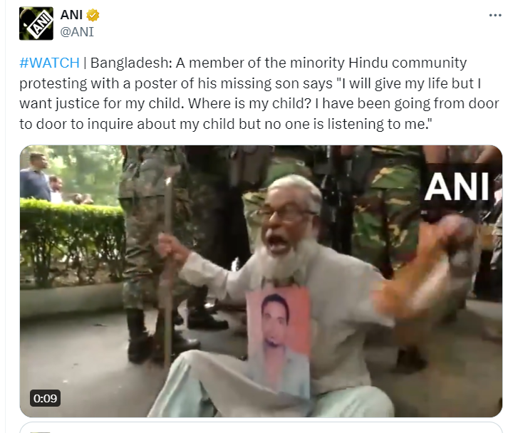 ANI द्वारा जारी एक वीडियो में अल्पसंख्यक हिंदू समुदाय का एक सदस्य अपने लापता बेटे का पोस्टर लेकर प्रदर्शन करते नजर आए। वीडियो में प्रदर्शन के दौरान उन्होंने कहा, 'मैं अपनी जान दे दूंगा, लेकिन मुझे अपने बच्चे के लिए न्याय चाहिए। मेरा बच्चा कहां है? मैं अपने बच्चे के बारे में पूछताछ करने के लिए दर-दर भटक रहा हूं, लेकिन कोई मेरी बात नहीं सुन रहा है।'