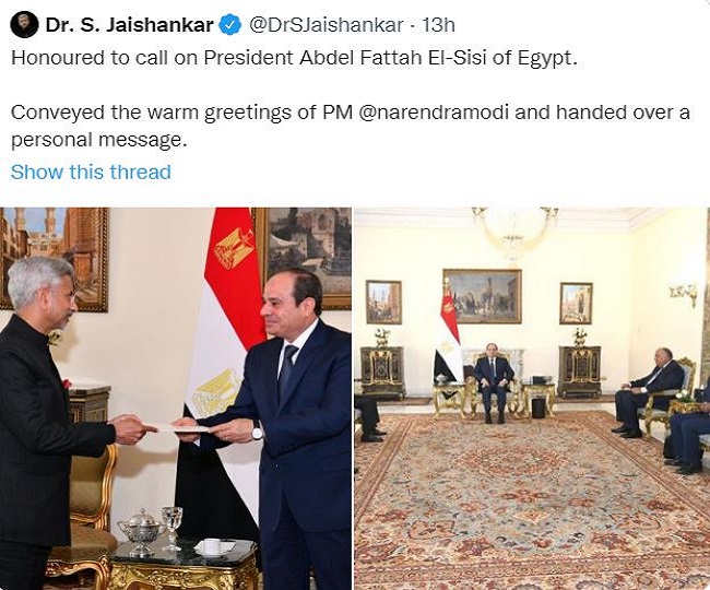 मिस्र के दो दिवसीय दौरे पर आए जयशंकर ने अपनी मुलाकात की जानकारी देते हुए ट्वीट किया, 'मिस्र के राष्ट्रपति अब्देल फतह अल-सीसी से मुलाकात कर सम्मानित महसूस कर रहा हूं। उन्हें प्रधानमंत्री नरेंद्र मोदी की तरफ से हार्दिक शुभकामनाएं और एक व्यक्तिगत संदेश दिया।'