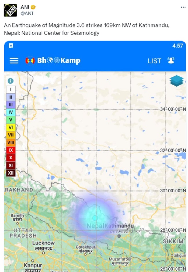 राष्ट्रीय भूकंप विज्ञान केंद्र ने बताया कि नेपाल के काठमांडू के 169 किमी उत्तर-पश्चिम में 3.6 तीव्रता का भूकंप आया है। हालांकि, इस भूकंप के कारण जानमाल के नुकसान की कोई खबर नहीं है।