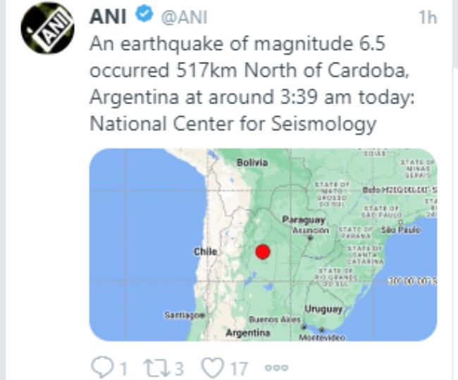 ब्यूनस आयर्स एएनआई। अर्जेंटीना में शुक्रवार तड़के भूकंप के काफी तेज झटके महसूस किए गए। जानकारी के मुताबिक अर्जेंटीना के कार्डोबा से 517 किमी उत्तर में आज तड़के करीब 3.39 बजे 6.5 तीव्रता का भूकंप आया था। फोटो- जागरण ग्राफिक्स।