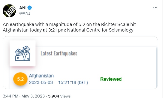 एनसीएस ने एक ट्वीट में कहा था, "भूकंप: 5.1, 02-05-2023 को आया, 16:01:56 IST, अक्षांश: 36.86 और लंबा: 71.59, गहराई: 72 किमी, स्थान: 96 किमी फैजाबाद।