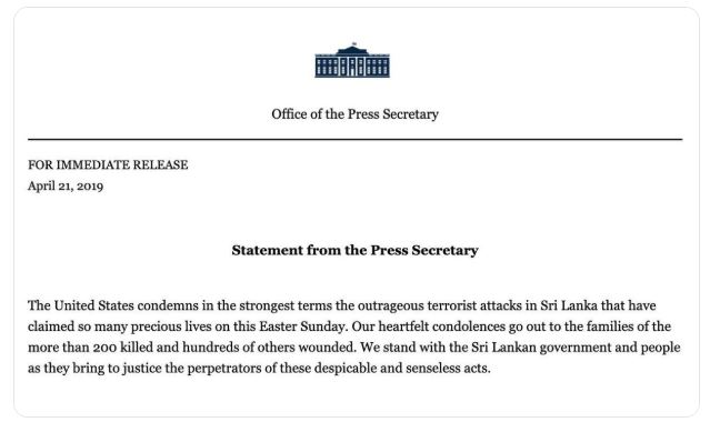 श्रीलंका में हुए सीरियल ब्लास्ट से पूरा विश्व गमगीन है। इस्टर के खास मौके पर हुए धमाकों में अब तक करीब 290 लोगों की मौत हो गई है। मरने वालों में 35 विदेशी समेत तीन भारतीय भी शामिल हैं। अमेरिका ने भी आधिकारिक बयान जारी करते हुए श्रीलंका सीरियल ब्लास्ट की कड़ी निंदा की है।