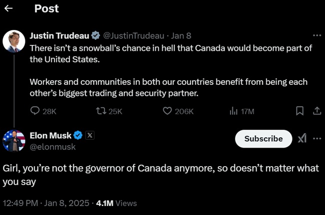 मस्क ने हाल ही में कनाडा के पूर्व प्रधानमंत्री जस्टिन ट्रूडो का मजाक उड़ाया था। उन्होंने कनाडा के पूर्व पीएम को मजाकिया अंदाज में लड़की कह दिया था। दरअसल, ट्रूडो ने एक्स पर लिखा था कि इस बात की कोई संभावना नहीं है कि कनाडा अमेरिका का हिस्सा बन जाएगा। हमारे दोनों देशों के श्रमिक और समुदाय एक-दूसरे के सबसे बड़े व्यापारिक और सुरक्षा साझेदार होने से फायदे में होते हैं।