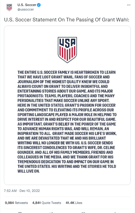 यूएस सॉकर बॉडी ने एक बयान में कहा कि ग्रांट की मौत के बारे में जानने का काफी दुख हुआ। यूएस सॉकर फेडरेशन ने कहा, "पूरा यूएस सॉकर परिवार यह जानकर दुखी है कि हमने ग्रांट वाहल को खो दिया है। अमेरिका में, फ़ुटबॉल के लिए ग्रांट का जुनून और हमारे खेल के प्रति रुचि और सम्मान बढ़ाने में मदद करने में एक प्रमुख भूमिका निभाई।'