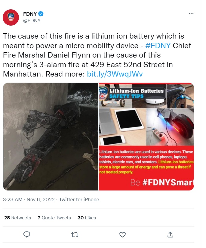 अधिकारियों के अनुसार, सुबह 10:30 बजे ईस्ट 52 स्ट्रीट पर इमारत में आग लगी। आग लगने का कारण माइक्रो-मोबिलिटी डिवाइस से जुड़ी लिथियम-आयन बैटरी बताई जा रही है। मुख्य एयर मार्शल डैन फ्लिन ने कहा, आग लगने का कारण लीथियम आयन बैटरी है। फ्लिन ने आगे कहा कि हम पिछले कुछ वर्षों से आग लगने के कई मामले देख रहे हैं। दमकल अधिकारियों ने बताया कि इमारत की ऊपरी मंजिलों पर रहने वाले कुछ लोग छत के रास्ते बाहर आए। न्यूयार्क की दमकल विभाग की आयुक्त लारा कवनाग ने बताया कि 20वीं मंजिल पर अज्ञात उपकरण में प्रयुक्त लिथियम बैटरी से आग लगी।