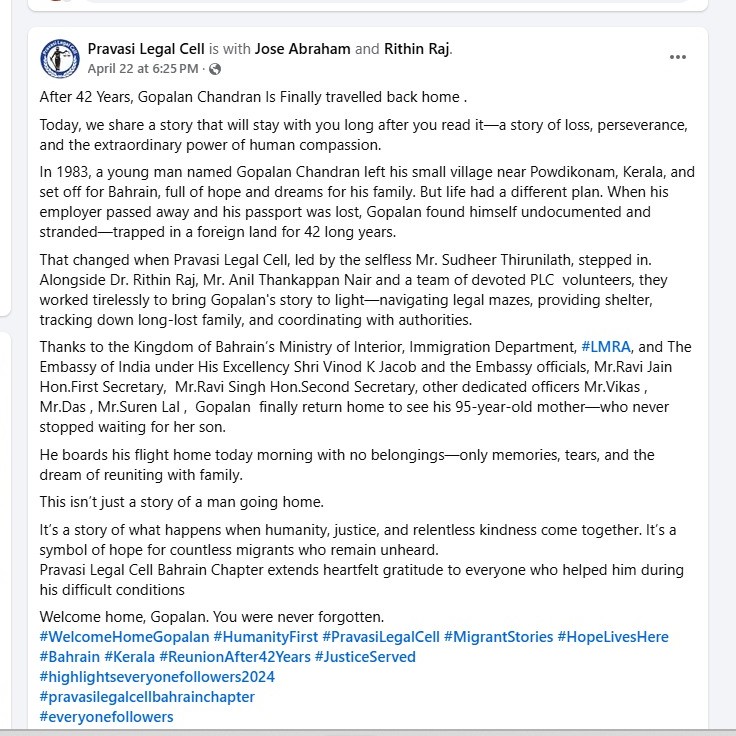 गोपालन 1983 में रोजगार की तलाश में बहरीन गए थे और फिर पासपोर्ट खो जाने से वहां फंस गए थे। प्रवासी लीगल सेल (PLC) ने सोशल मीडिया पोस्ट में 74 वर्षीय गोपालन चंद्रन की पूरी कहानी और वापसी की जानकारी दी।