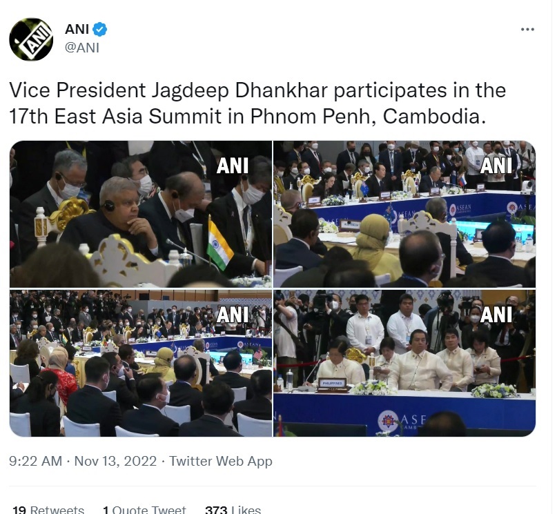इस दौरान धनखड़ ने शनिवार को पूर्वी एशिया शिखर सम्मेलन को संबोधित किया। अपने संबोधन में उन्होंने भारत और आसियान देशों के संबंधों पर चर्चा की। उन्होंने व्यापक रणनीतिक साझेदारी स्थापित करने की भी बात की। धनखड़ ने अपने संबोधन में कहा, "भारत और एशियाई देशों के बीच मौजूद सांस्कृतिक, आर्थिक संबंधों ने 1992 में एक केंद्रीय साझेदारी से 2022 में एक व्यापक रणनीतिक साझेदार के रूप में आधुनिक समय में एक मजबूत संबंध बनाने की नींव प्रदान की है"।