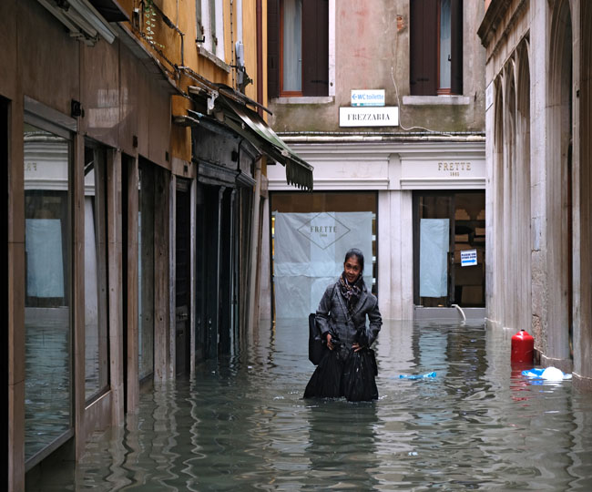 वेनिस में भले ही बाढ़ का पानी भरा है लेकिन, यहां के लोगों के चेहरे की हंसी बताती है कि सब कुछ ठीक है। आपको बता दें कि यह वेनिस के इतिहास की सबसे जबरदस्त बाढ़ है। लेकिन, इसका भी यहां के लोग पूरा मजा ले रहे हैं।