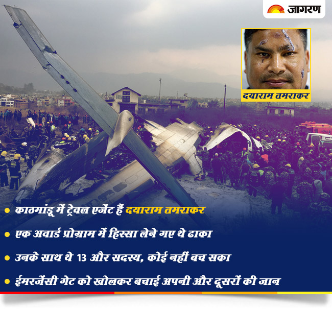 नई दिल्ली [स्पेशल डेस्क]। चार दिन पहले नेपाल में हुए विमान हादसे में बचे एक नेपाली ट्रेवल एजेंट ने उस वक्त का जिक्र किया है जब यूएस बांग्ला एयरलाइंस का विमान दुर्घटनाग्रस्त हुआ था। इस घटना के बारे में बताने से पहले आपको बता दें कि इस हादसे के बारे में बताने वाले शख्स का नाम दयाराम तमराकर है, जो कि एक ट्रेवल एजेंट हैं। हादसे के वक्त दयाराम इसी विमान में मौजूद थे।