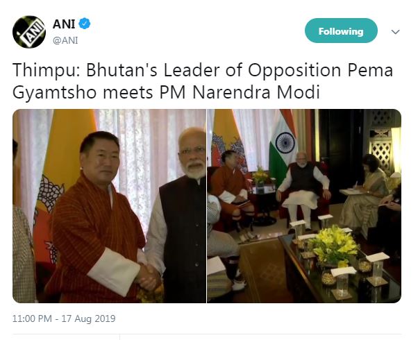 इसके पहले उन्होंने भूटान के नेता प्रतिपक्ष पेमा गिमत्सो से मुलाकात की थी। इससे पहले वह थिंपू में नेशनल मेमोरियल चोर्टेन गए थे।