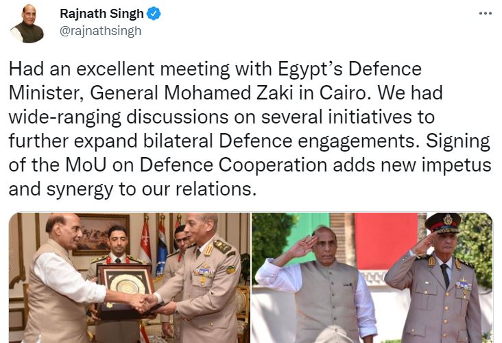 राजनाथ सिंह ने एक ट्वीट में कहा, 'मिस्र के रक्षा मंत्री जनरल मोहम्मद जकी के साथ काहिरा में बैठक हुई। इस दौरान हमने द्विपक्षीय रक्षा संबंधों को और विस्तारित करने के लिए कई पहलों पर महत्वपूर्ण चर्चा की। रक्षा सहयोग पर समझौता ज्ञापन पर हस्ताक्षर करने से दोनों देशों को एक नई गति मिलती है और हमारे संबंधों के लिए तालमेल बढ़ते हैं।'