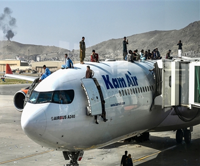 (काबुल एयरपोर्ट पर विमान की छत पर चढ़े लोग)