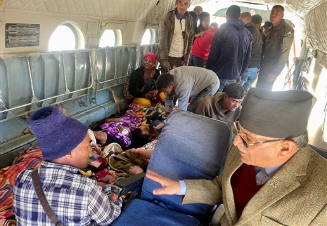 नेपाल के प्रधान मंत्री, पुष्प कमल दहल 4 नवंबर, 2023 को जाजरकोट, नेपाल में भूकंप के बाद एक हेलीकॉप्टर के अंदर बचाए गए लोगों से बात करते हुए। (फोटो- एपी)