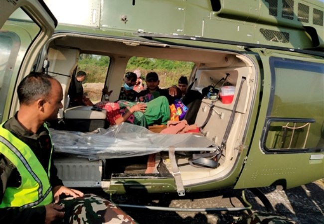 4 नवंबर, 2023 को जाजरकोट, नेपाल में आए भूकंप के बाद एक घायल व्यक्ति को हेलीकॉप्टर से अस्पताल ले जाया गया। (फोटो- एपी)