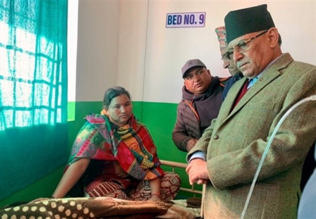 नेपाल के प्रधान मंत्री पुष्प कमल दहल 4 नवंबर, 2023 को जाजरकोट, नेपाल में भूकंप के बाद एक अस्पताल में एक महिला से मिलने गए। (फोटो- रॉयटर्स)