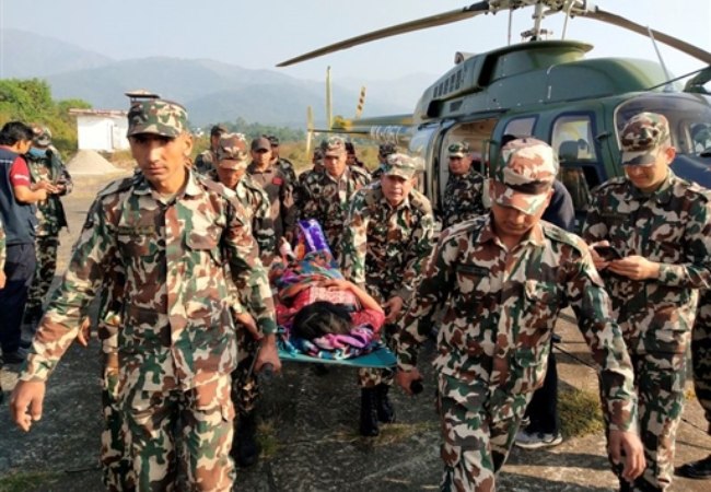 अधिकारियों ने शनिवार को कहा कि शुक्रवार आधी रात से ठीक पहले उत्तर-पश्चिमी नेपाल के जिलों में आए तेज भूकंप में घायल लोगों की मदद के लिए हेलीकॉप्टर और जमीनी सैनिक पहुंचे, जिसमें 100 से अधिक लोग मारे गए और दर्जनों अन्य घायल हो गए हैं। (फोटो- एपी)