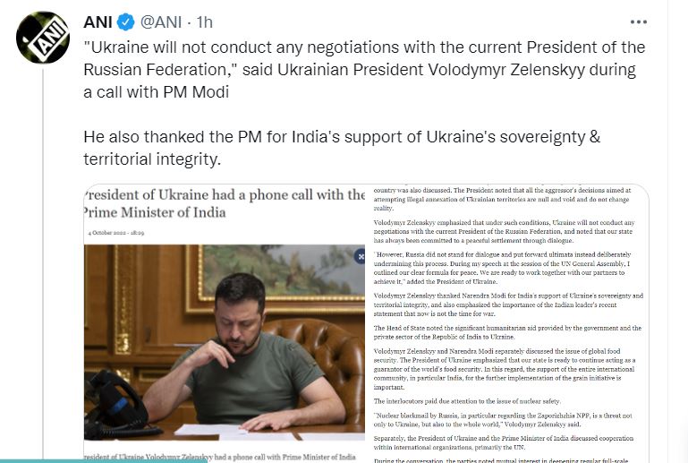 जेलेंस्की ने यूक्रेन की संप्रभुता और क्षेत्रीय अखंडता के लिए भारत के समर्थन के लिए भी प्रधानमंत्री मोदी को धन्यवाद दिया। यूक्रेन के राष्ट्रपति जेलेंस्की ने भी पीएम मोदी के हालिया बयान के महत्व पर जोर दिया कि अब युद्ध का समय नहीं है।