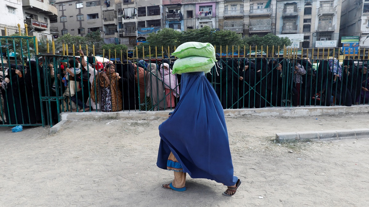 तस्वीर में पाकिस्तान की एक महिला अपने सिर पर आटे की बोरियां ढो रही है, जिसे एक ट्रक से रियायती दरों पर खरीदा है।