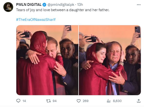 उन्होंने आगे बताया कि कैसे उन्हें (अपने भाई और पूर्व विदेश मंत्री) शहबाज, मरियम और अन्य पीएमएल-एन नेताओं के खिलाफ "झूठे मामलों" पर खेद है और फिर दावा किया कि "राष्ट्र के साथ उनका रिश्ता वैसा ही है, जैसा उनके देश छोड़ने के समय था।" उन्होंने कहा, " अपने लोगों की आंखों में वफादारी देखकर गर्व हुआ।"