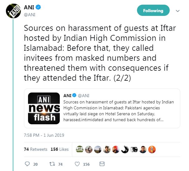 इस्लामाबाद,एएनआइ। रमजान के पाक महीने में पाकिस्तान ने एक बार फिर नापाक हरकत की है। दरअसल, यहां भारतीय उच्चायोग की इफ्तार पार्टी में आए मेहमानों के साथ पाकिस्तानी अधिकारियों ने बुरा बर्ताव किया। इफ्तार पार्टी शुरू होने से पहले जब मेहमान आने लगे तो उनके साथ बुरा व्यवहार किया गया और उन्हें डराया धमकाया गया।
