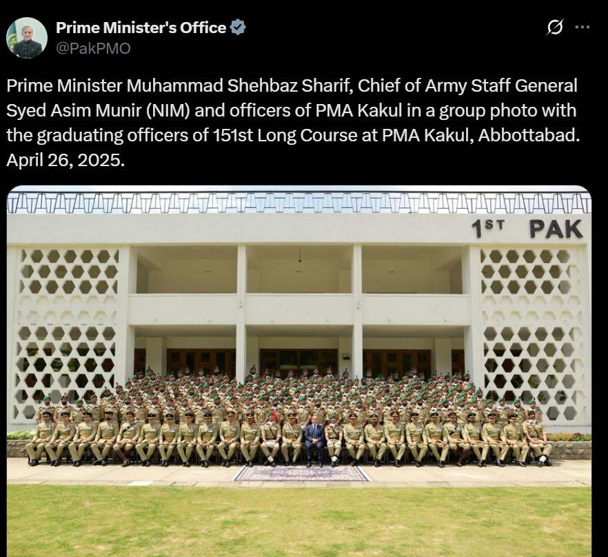 इस तस्वीर के साथ कैप्शन में लिखा था, "पीएम मोहम्मद शहबाज शरीफ, सेना प्रमुख जनरल सैयद असीम मुनीर और पीएमए काकुल के अधिकारी एबटाबाद में 151वें लॉन्ग कोर्स के स्नातक अधिकारियों के साथ एक ग्रुप फोटो। 26 अप्रैल, 2025।"