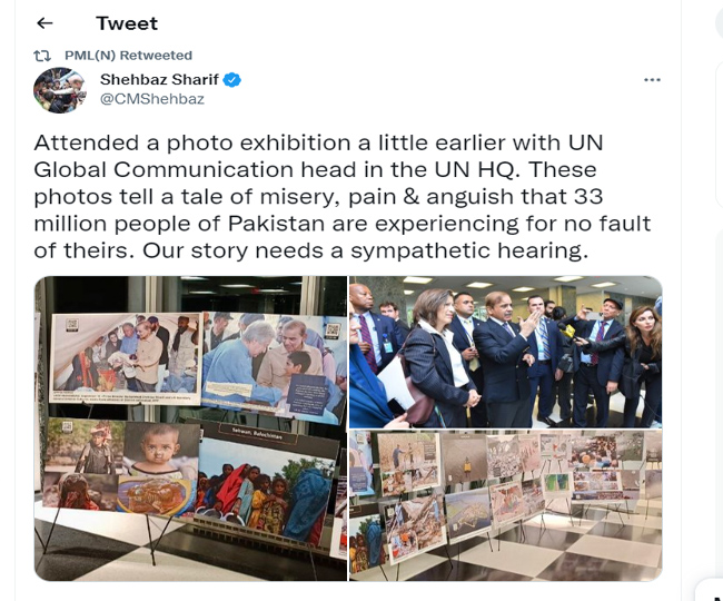 शहबाज शरीफ ने न्यूयार्क में पत्रकारों से हुई वार्ता के दौरान बताया है कि यूएन हैडक्वार्टर में आम सभा में भाग लेने आए प्रतिनिधियों का ध्यान खींचने के लिए देश में आई बाढ़ की एक प्रदर्शनी भी लगाई गई है। यूएन चीफ की सलाह के बाबत पूछे गए एक सवाल के जवाब में उन्होंने कहा कि फिलहाल डोनर कांफ्रेंस की तारीख अब तक तय नहीं की गई है। उन्होंने उम्मीद जताई कि ये जल्द ही तय कर ली जाएगी। शहबाज शरीफ का कहना है कि इस बाढ़ से एक करोड़ घर तबाह हो गए हैं और 40 लाख एकड़ कृषि तबाह हो गई है। करीब 9 लाख पशुधन का नुकसान इस बाढ़ में हुआ है। हजारों किमी लंबी सड़के पूरी तरह से बर्बाद हो गई हैं।
