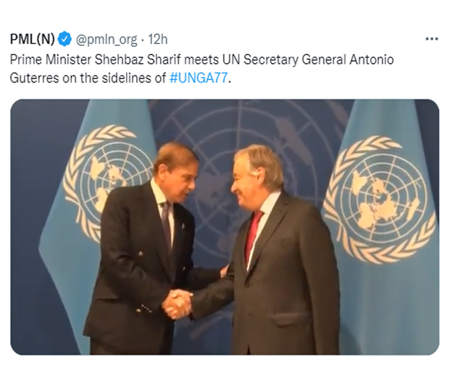 नई दिल्ली (आनलाइन डेस्क)। पाकिस्तान में बाढ़ से हुई भीषण तबाही के लिए न सिर्फ पीएम शहबाह शरीफ पूरी दुनिया से मदद मांग रहे हैं बल्कि यूएन ने भी दुनिया के देशों से पीडि़तों के लिए मदद करने की अपील की है। संयुक्त राष्ट्र महासभा के 77वें सत्र में हिस्सा लेने के लिए पीएम शहबाज शरीफ इन दिनों न्यूयार्क में हैं। यहां पर ही उन्होंने यूएन चीफ से मुलाकात की है। इसको लेकर पीएमएल-एन ने एक ट्वीट भी किया है। पीएम शहबाज शरीफ आज शुक्रवार 23 सितंबर 2022 को असेंबली को संबोधित करने वाले हैं। आज उनका जन्मदिन भी है।