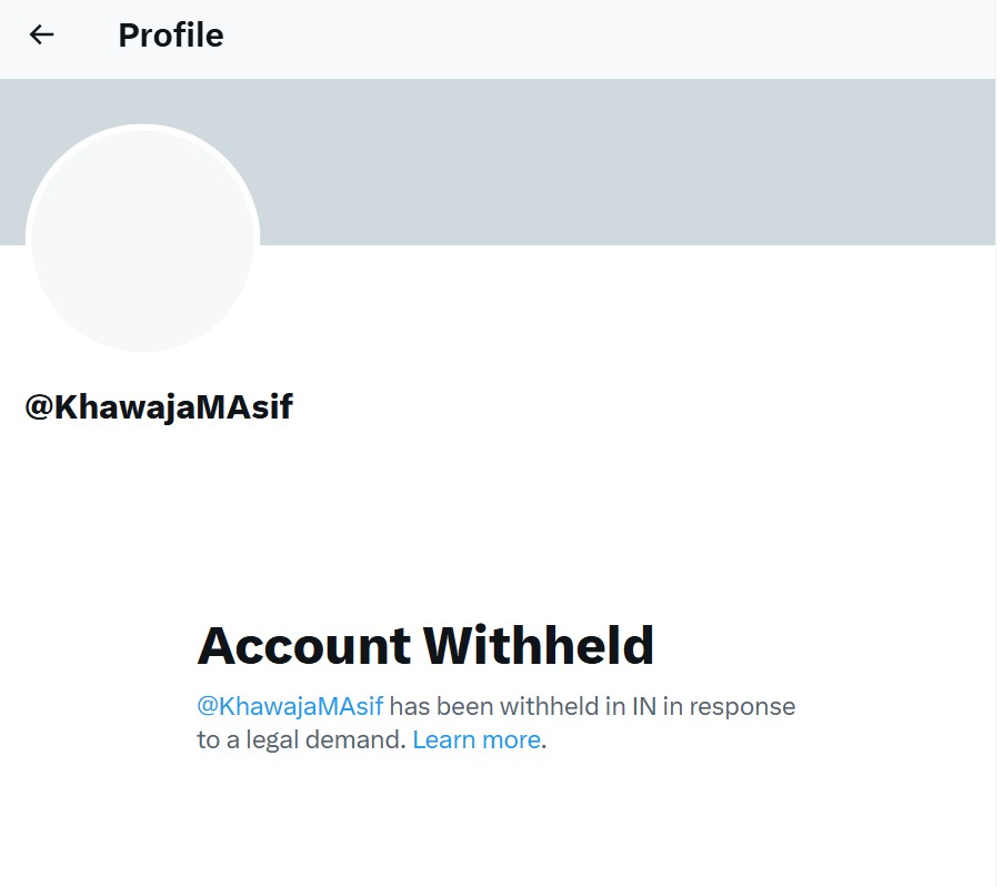 पाकिस्तान के रक्षा मंत्री ख्वाजा मुहम्मद आसिफ का एक्स अकाउंट अब भारत में नहीं खुल रहा है। एक्स पर उनका नाम तो दिखाई दे रहा है, लेकिन अकाउंट सस्पेंड हो चुका है। इसकी जानकारी देते हुए एक्स प्लेटफॉर्म ने लिखा है कि कानूनी मांग के चलते @KhawajaMAsif को बंद कर दिया गया है।