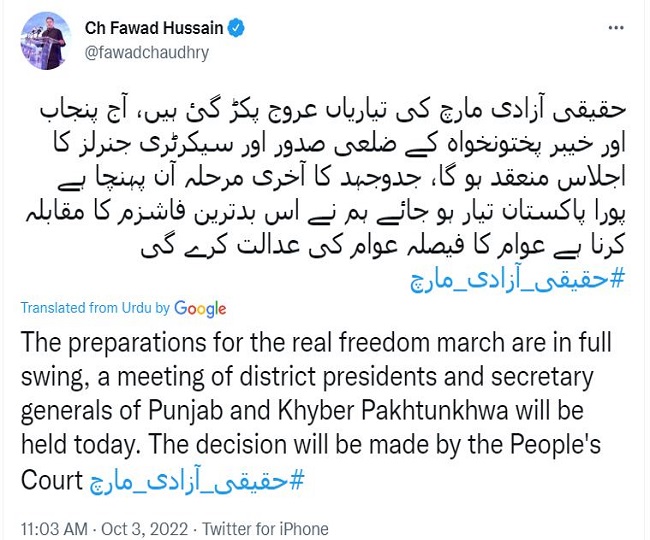 पूर्व सूचना मंत्री और पीटीआई के वरिष्ठ सदस्य, फवाद चौधरी ने कहा कि राष्ट्र को लॉन्ग मार्च की तैयारी शुरू कर देनी चाहिए क्योंकि यह एकमात्र विकल्प बचा है जिसे उन्होंने 'सत्ता की आयातित सरकार' करार दिया। उन्होंने कहा, 'यह सरकार देश के बहुमत की सहमति नहीं रखती है और एक शासन परिवर्तन की साजिश के माध्यम से सत्ता में लाई गई है। देश को अब एक लॉन्ग मार्च की तैयारी शुरू कर देनी चाहिए क्योंकि इमरान खान ही सच्चे नेता हैं जो पूरे देश की भावनाओं का प्रतिनिधित्व करते हैं।'