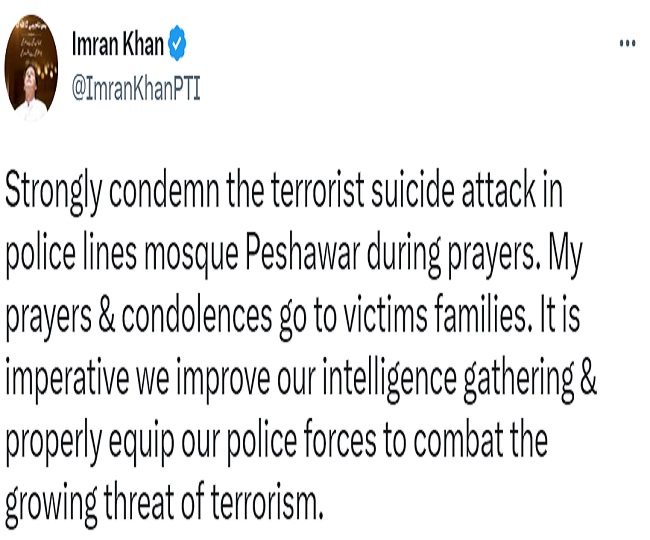 वहीं, इमरान खान ने आतंकवादी आत्मघाती हमले की निंदा की और उन्होंने पीड़ित परिवारों के प्रति सहानुभूति भी व्यक्त की। इमरान खान ने कहा कि पेशावर की पुलिस लाइन मस्जिद में ज़ुहर की नमाज के दौरान हुए आतंकी आत्मघाती हमले की निंदा करता हूं। मेरी प्रार्थना और संवेदनाएं पीड़ित परिवारों के साथ हैं। यह जरूरी है कि हम अपनी खुफिया जानकारी जुटाने में सुधार करें और आतंकवाद के बढ़ते खतरे से निपटने के लिए अपने पुलिस बलों को उचित रूप से तैयार करें।