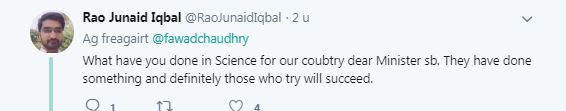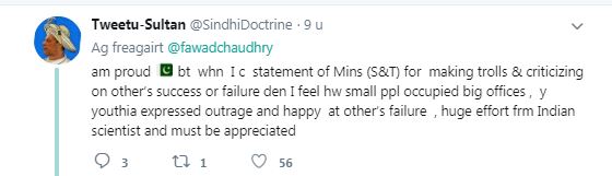 एक ट्वीटू सुल्तान नाम के यूजर ने लिखा कि मैं पाकिस्तानी होने पर गर्व महसूस करता हूं। लेकिन जब विज्ञान और तकनीकी मंत्री को किसी के सफलता और असफलता पर बयान देते देखता हूं तो मुझे लगता है कि छोटे लोगों ने बड़े कार्यालयों पर कब्जा कर लिया है।