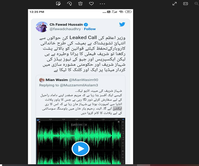 इस ट्वीट में उन्होंने एक ओडियो क्लिप को शामिल किया है। ये ओडियो क्लिप कथिततौर पर पीएम शहबाज शरीफ और उनके एक अधिकारी के बीच की बताई गई है। पीटीआई ने आरोप लगाया है कि शहबाज शरीफ किस तरह से अपने रिश्तेदारों को खुश करने का काम कर रही है। इस क्लिप के सामने आने के बाद अब पाकिस्तान के चैनलों पर इसको लेकर बहस शुरू हो गई है।
