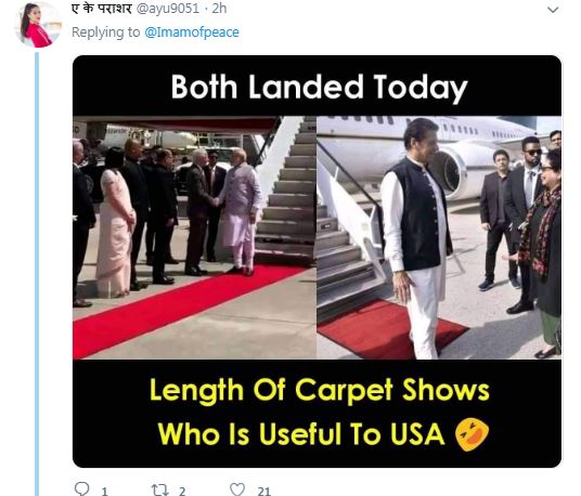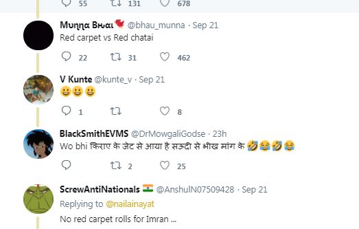 इमरान का अमेरिका में जिस तरह से स्वागत हुुुआ, उसका कोई और नहीं बल्कि पाकिस्तानी ही मजाक उड़ा रहे हैं। दरअसल इमरान जब प्लेन से उतरे तो उनके आगे रेड कार्पेट भी लगभग एक फुट का ही बिछा था। पाकिस्तानी पत्रकार नायला इनायत ने इसे लेकर एक वीडियो शेयर किया। इसे लेकर इमरान का मजाक उड़ाया जा रहा है। एक यूजर ने लिखा, किराए के जेट से आया है सऊदी से भीख मांग के।