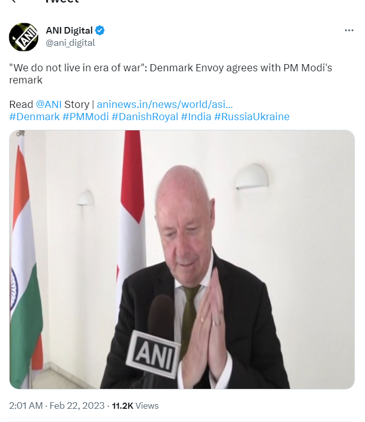 रूस-यूक्रेन युद्ध के बीच अब भारत में डेनमार्क के राजदूत फ्रेडी स्वान ने बयान जारी किया है। फ्रेडी ने इस युद्ध को रोकने के भारत के प्रयास की तारीफ की है। उन्होंने कहा कि रूस और यूक्रेन के बीच युद्ध को रोकने के लिए भारत पहले से ही बहुत कुछ कर रहा है। प्रधानमंत्री नरेन्द्र मोदी की टिप्पणी को उद्धृत करार देते हुए फ्रेडी ने कहा कि हम युद्ध के युग में नहीं रहते हैं।