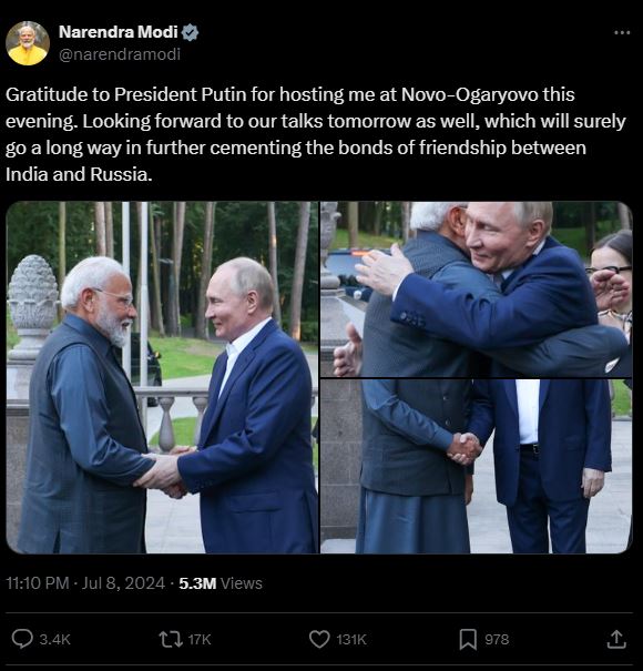 अपनी अनौपचारिक बैठक की तस्वीरें साझा करते हुए, पीएम मोदी ने सोशल मीडिया एक्स (जिसे पहले ट्विटर के नाम से जाना जाता था) पर लिखा कि मैं राष्ट्रपति पुतिन को आज शाम नोवो-ओगारेवो में मेरा स्वागत करने के लिए धन्यवाद देता हूं।