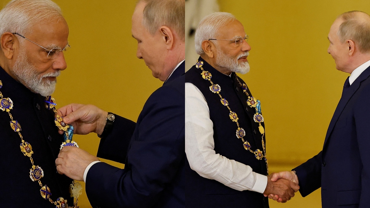रूस के राष्ट्रपति व्लादिमीर पुतिन ने रूस के क्रेमलिन में भारत के प्रधानमंत्री नरेंद्र मोदी को ऑर्डर ऑफ सेंट एंड्रयू द एपोस्टल द फर्स्ट-कॉल से सम्मानित किया।