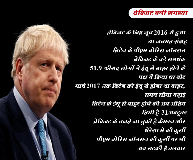 नई दिल्ली जागरण स्पेशल। ब्रेक्जिट की अंतिम उलटी गिनती शुरू हो चुकी है। ब्रिटेन के यूरोपीय संघ से अलग होने के लिए 31 अक्टूबर आखिरी दिन है। यदि यूरोपीय संघ (European Union) से किसी तरह की सहमति नहीं बन सकी तो ब्रिटेन ईयू से बिना समझौते के अलग हो जाएगा। गौरतलब है कि ब्रेक्जिट (Brexit) की वजह से अब तक दो प्रधानमंत्रियों को अपने पद से हाथ धोना पड़ा है। इनमें पहले डेविड कैमरन हैं तो दूसरी थेरेसा मे हैं। अब बॉरिस जॉनसन भी इसी राह पर आगे बढ़ रहे हैं। माना जा रहा है कि जॉनसन भी इसी फहरिस्त के तीसरे व्यक्ति हो सकते हैं। बहरहाल, आगे बढ़ने से पहले आपको बता दें कि जून 2016 में जनमत संग्रह कराने के बाद यह तय हुआ था कि ब्रिटेन ईयू से अलग होगा। इसके लिए 51.9 फीसद लोगों ने ईयू से बाहर होने के पक्ष में वोट दिया था।मार्च 2017 से मार्च 2019 तक ब्रिटेन को सभी प्रक्रियाओं को पूरा कर ईयू से बाहर होना था। तय समय के बीच यह संभव नहीं हो सका जिसके बाद इसके लिए 31 अक्टूबर की आखिरी तारीख तय की गई थी।