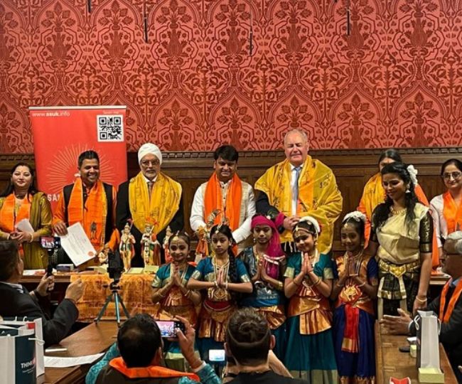 ब्रिटेन की सनातन संस्था (SSUK) ने ब्रिटिश संसद में राम मंदिर के लिए खुशी का जश्न मनाने की शुरुआत की और संसद के अंदर शंख बजाए, जिससे पूरा माहौल राममय हो गया। संसद में कार्यक्रम की शुरुआत एक भावपूर्ण भजन से हुई, जिसके बाद एसएसयूके के सदस्यों ने काकभुशुण्डि संवाद (Kakbhushundi Samvad) को प्रस्तुत किया। सदस्यों ने बाद में गीता के 12वें अध्याय का गहन अध्ययन करके भगवान श्री-कृष्ण के जीवन को याद किया।